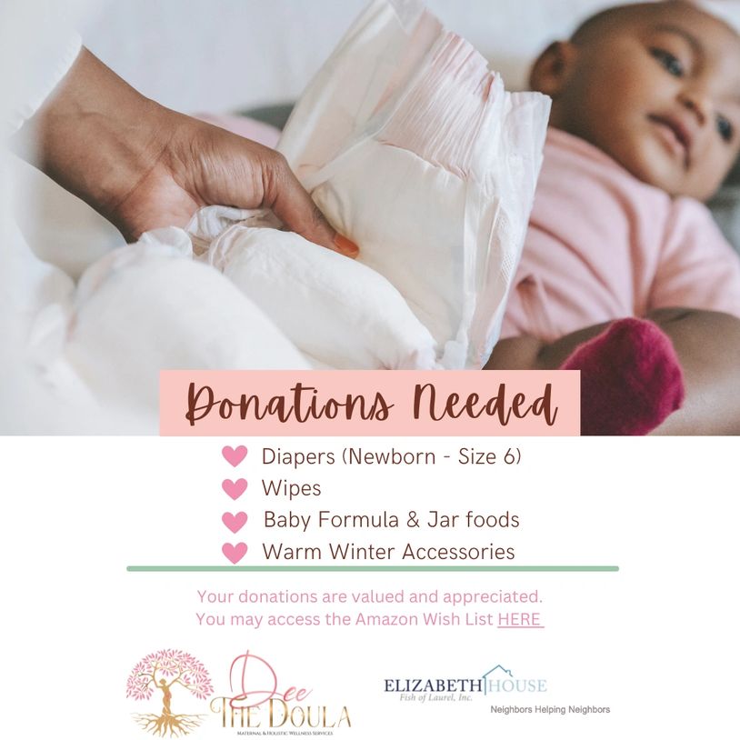 DeeTheDoula MHWS LLC has recently joined forces with Elizabeth's House to support moderate to low-income families in stocking items for newborn and infant care necessities.